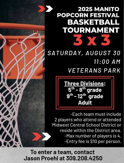 The Manito Popcorn Festival Manito Madness 3 on 3 Basketball Tournament will be held on Saturday, August 30, 2025 at Veterans’ Park at 11:00am immediately following the parade.